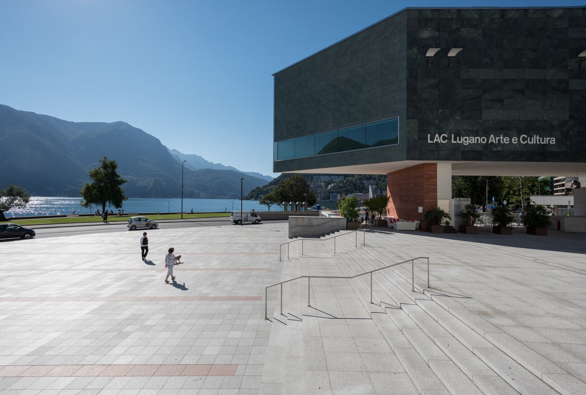 L’esperienza di visita al LAC inizia fin dall’esterno. La piazza Bernardino Luini accoglie il pubblico con i suoi vasti spazi, che abbracciano l’armonioso contrasto tra l’architettura del LAC, con la sua trasparenza e i suoi volumi e la facciata neoclassica dell’ex Grand Hotel Palace.